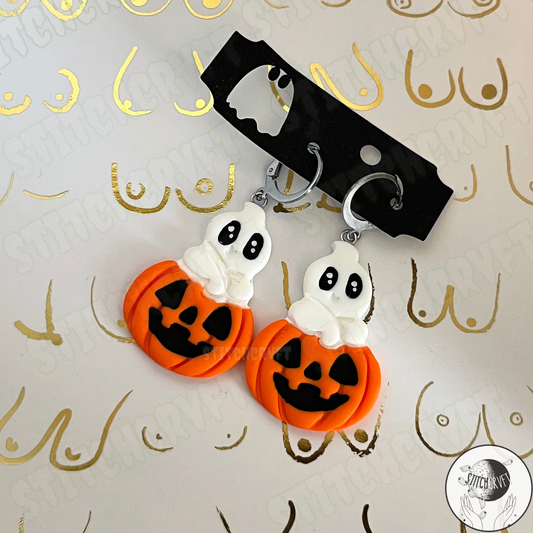 Sheet ghost earrings holding tiny pumpkin with glowing eyes | Handmade to order