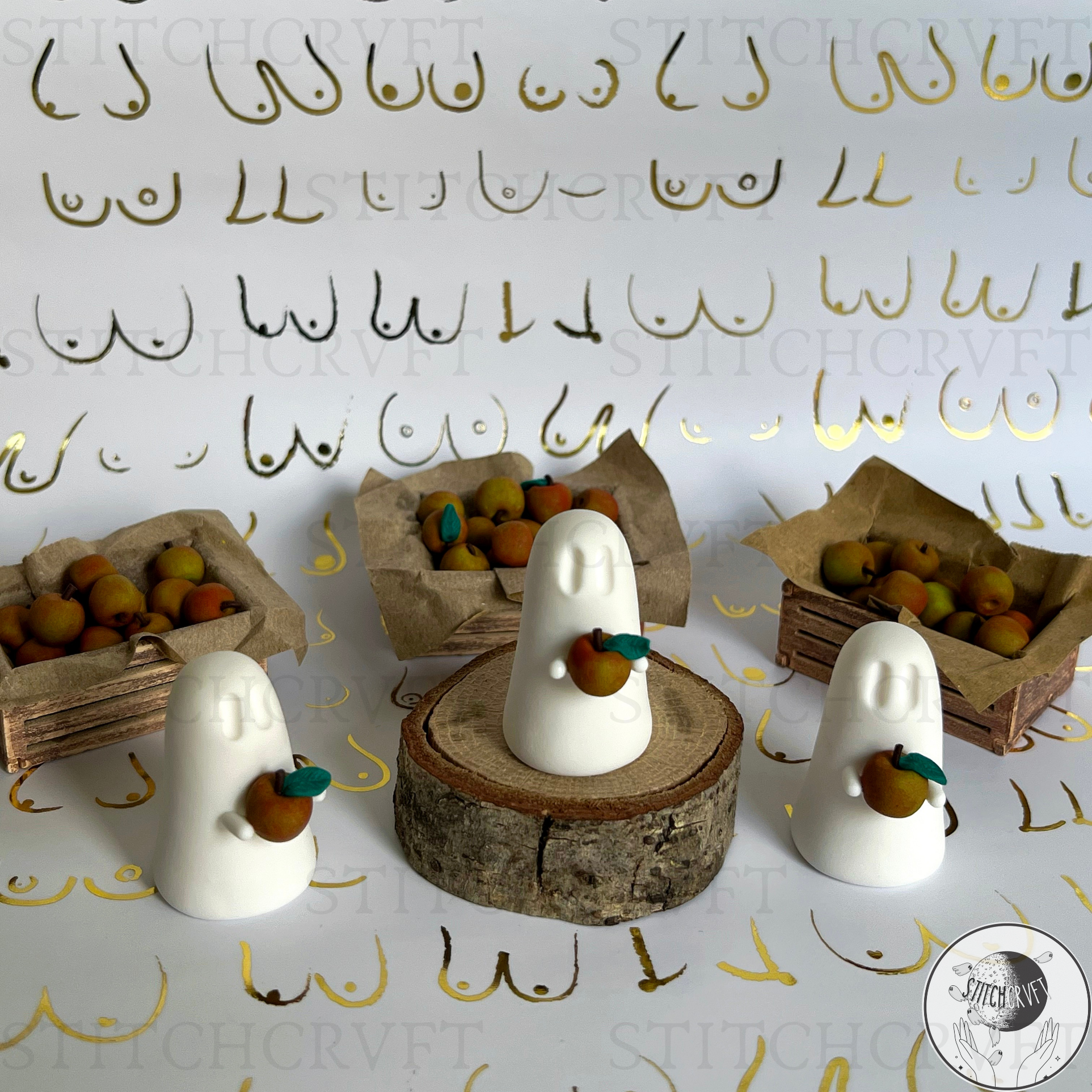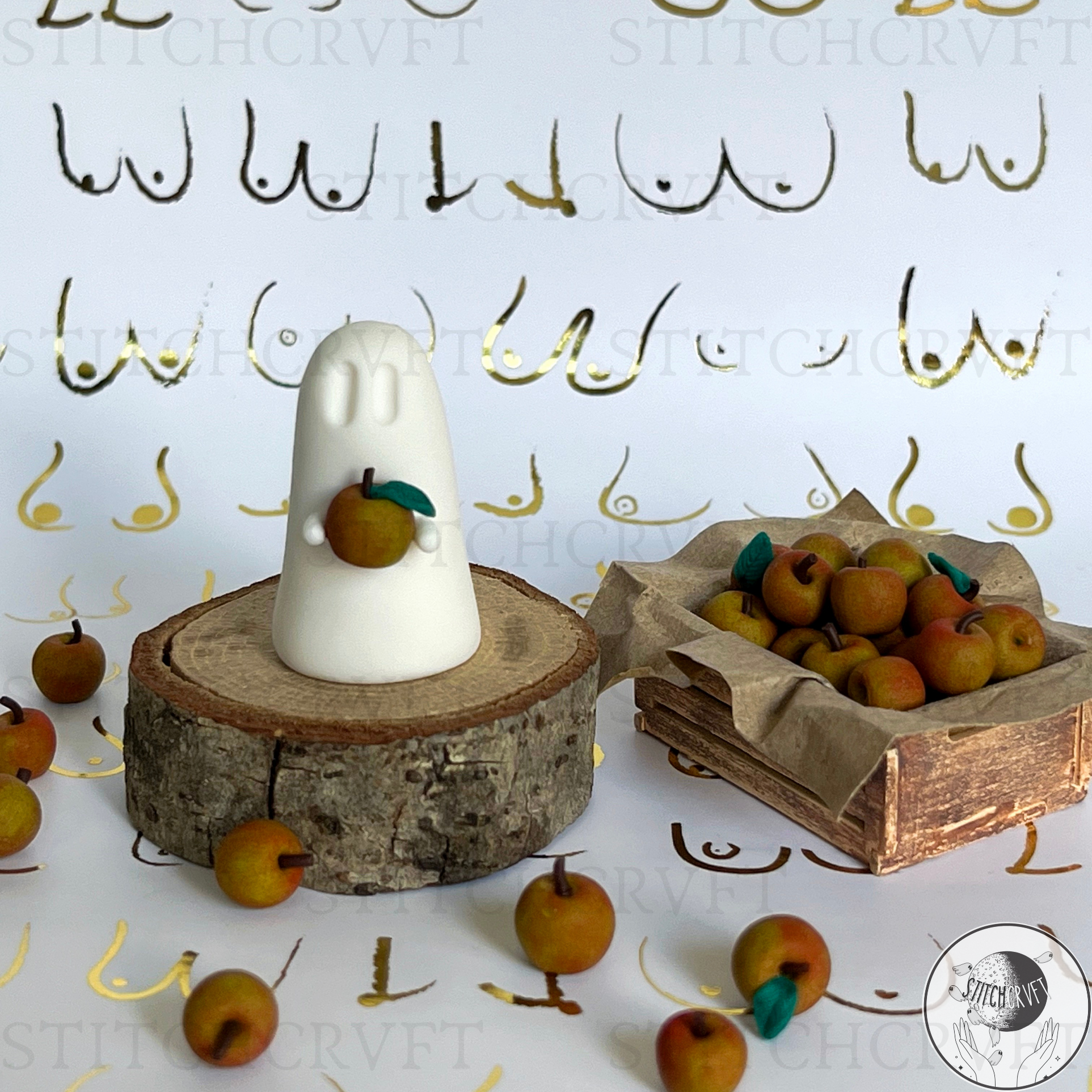 Each ghost comes with a tiny wooden crate filled with loose apples.
