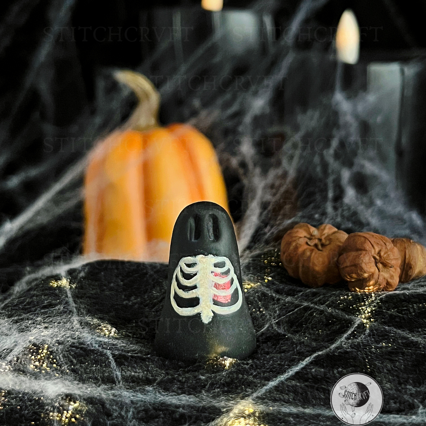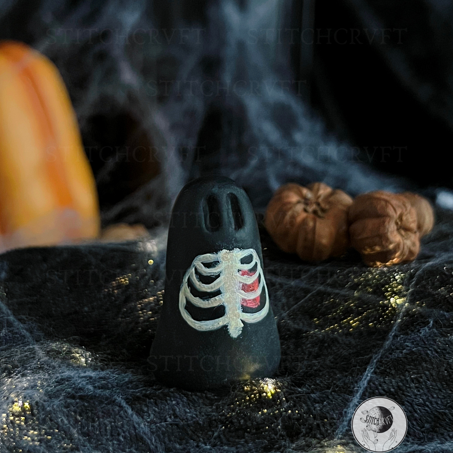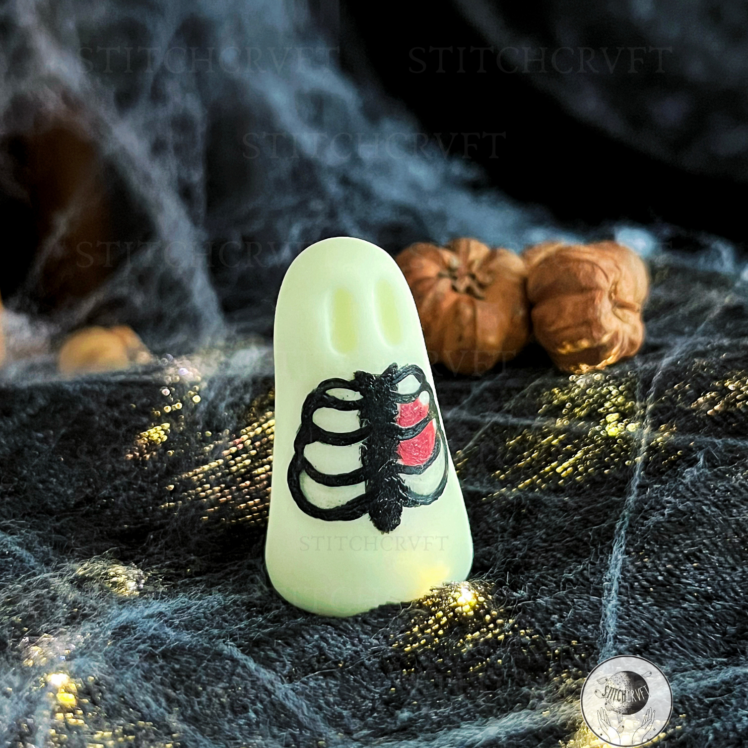 Ghost with painted tiny ribcage and heart | Black or glowing | Handmade to order