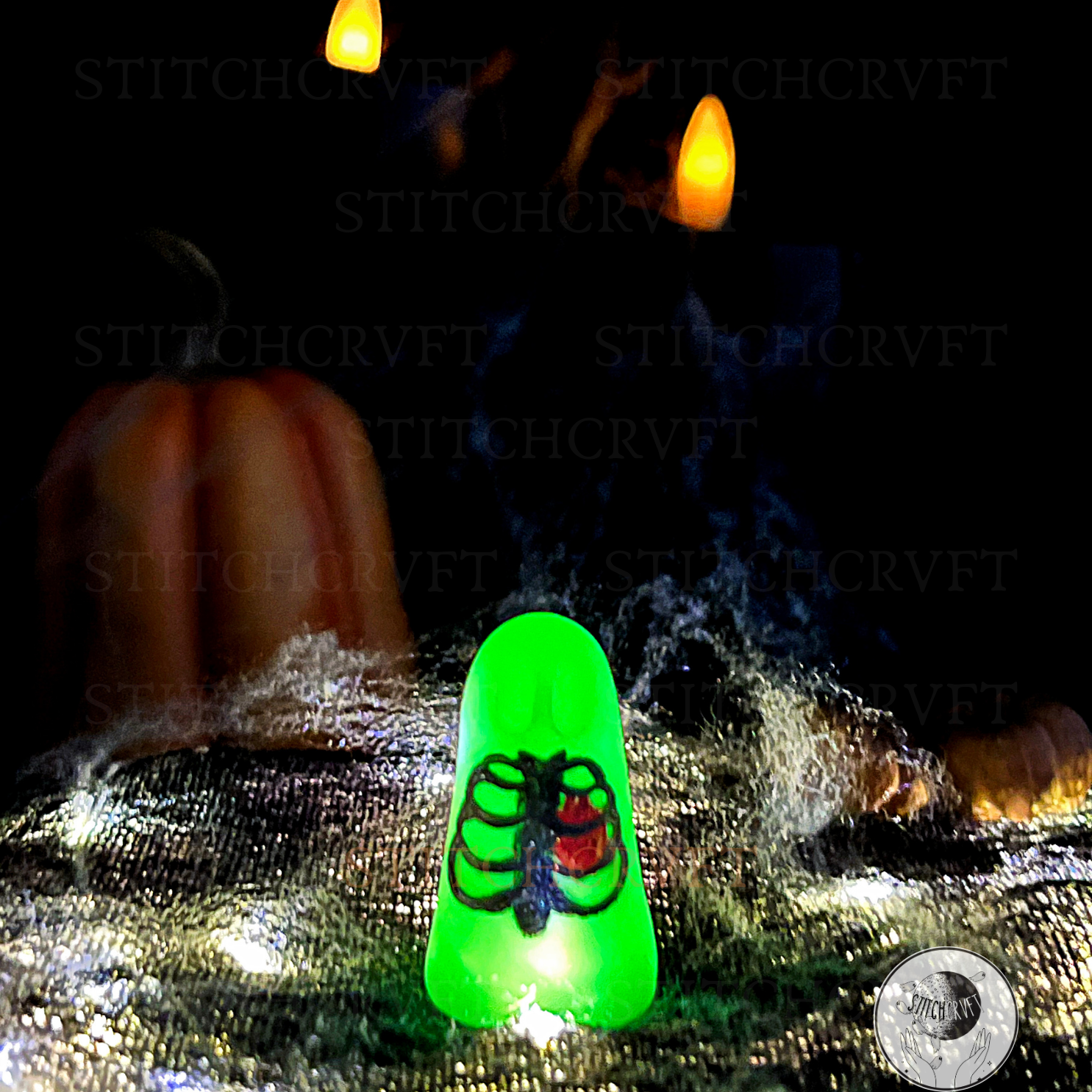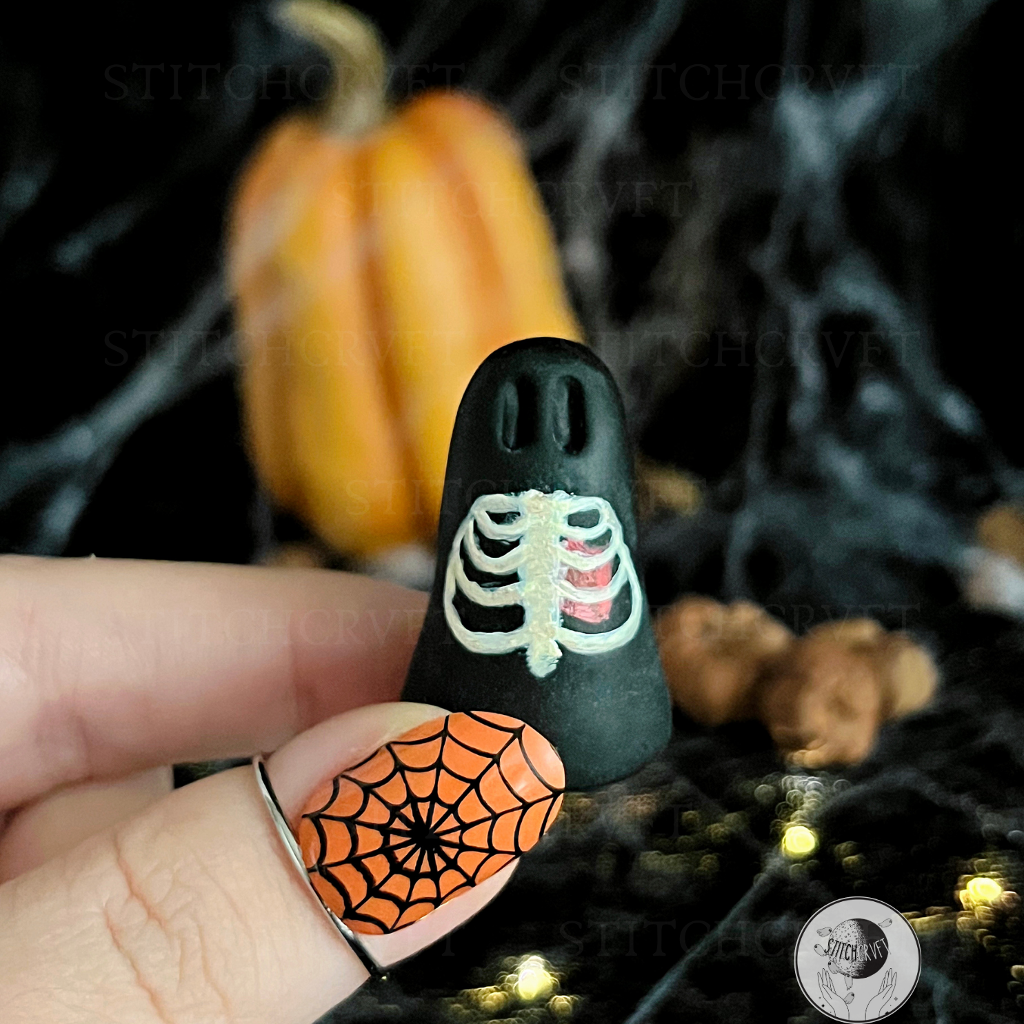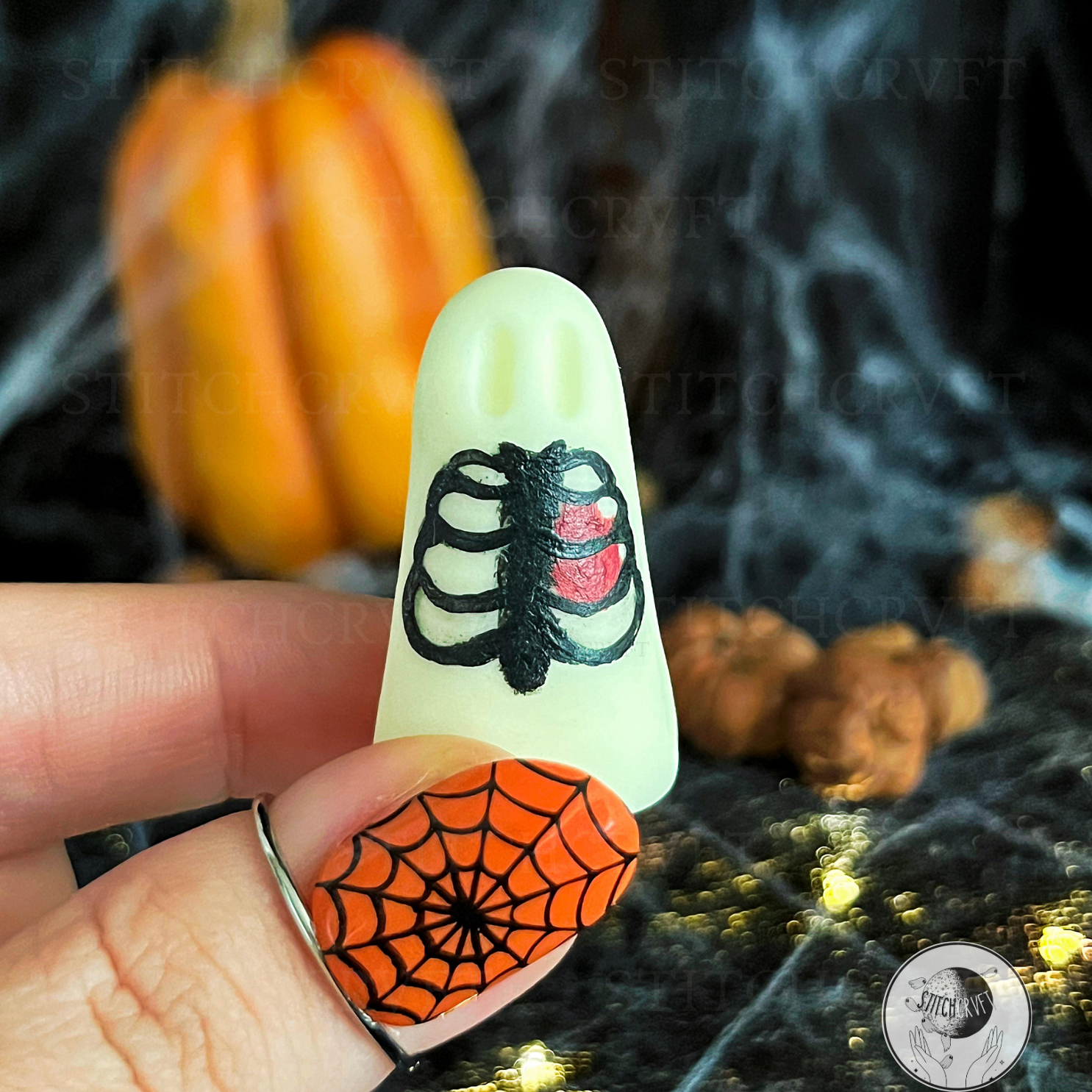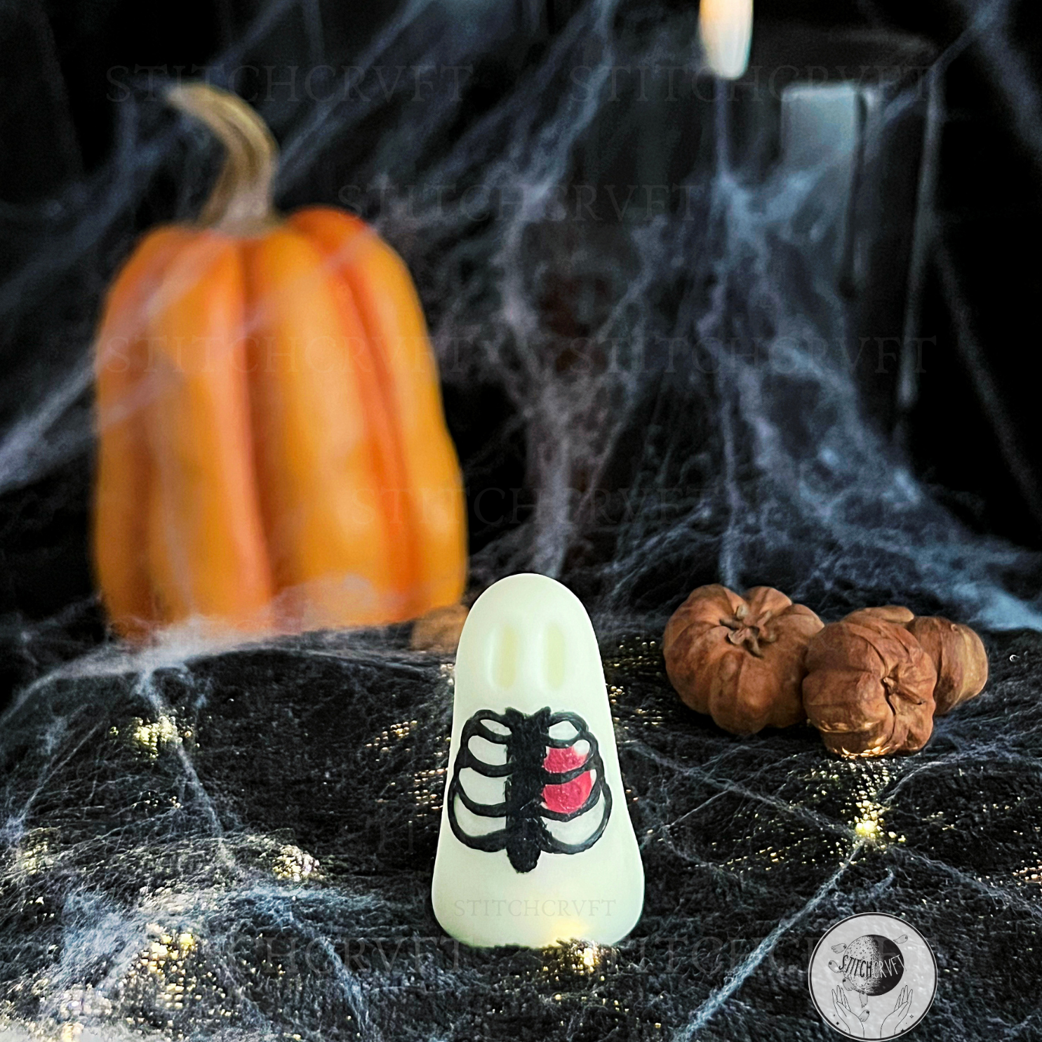 Ghost with painted tiny ribcage and heart | Black or glowing | Handmade to order