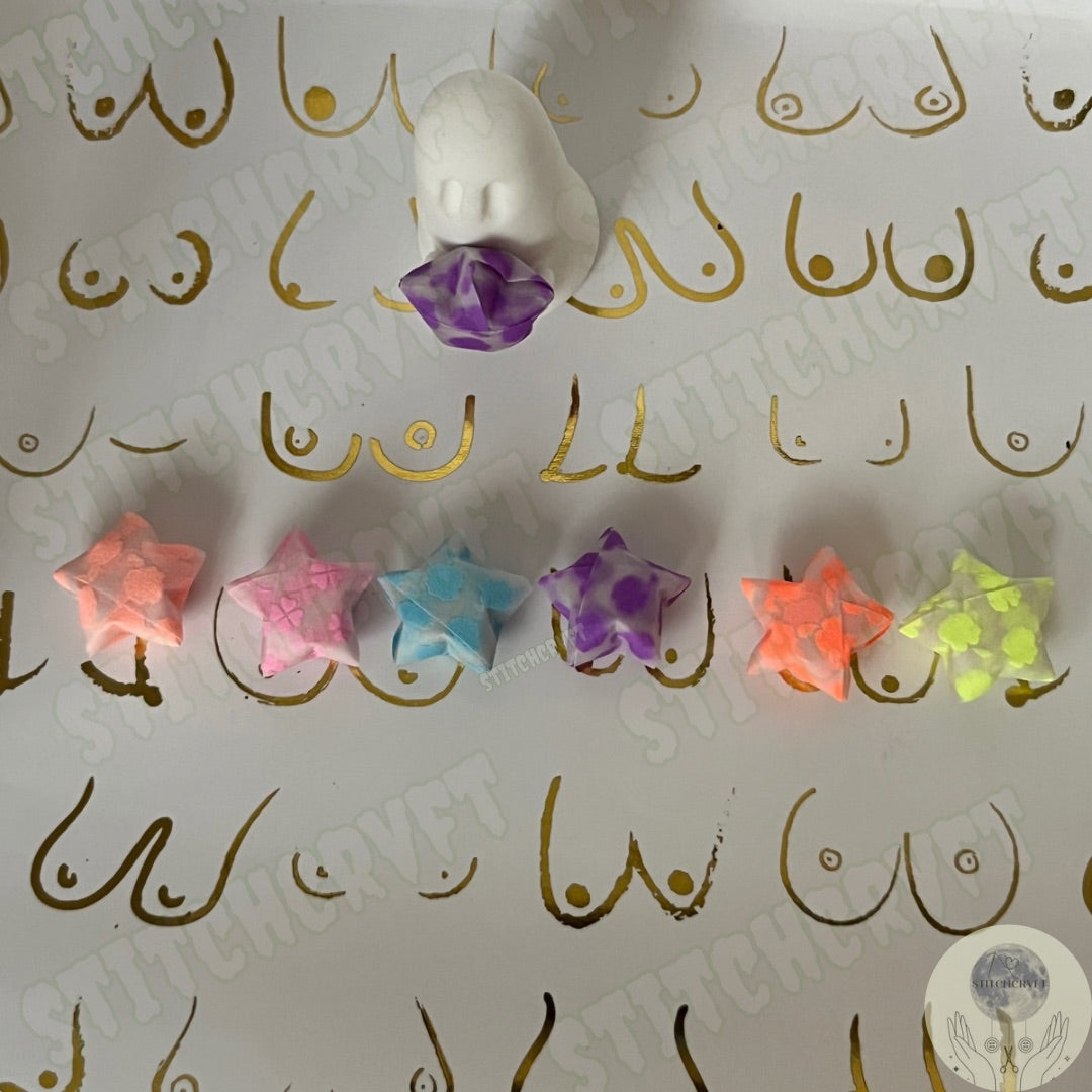 This cute little fiend is called Aster, and is holding a tiny folded paper star.