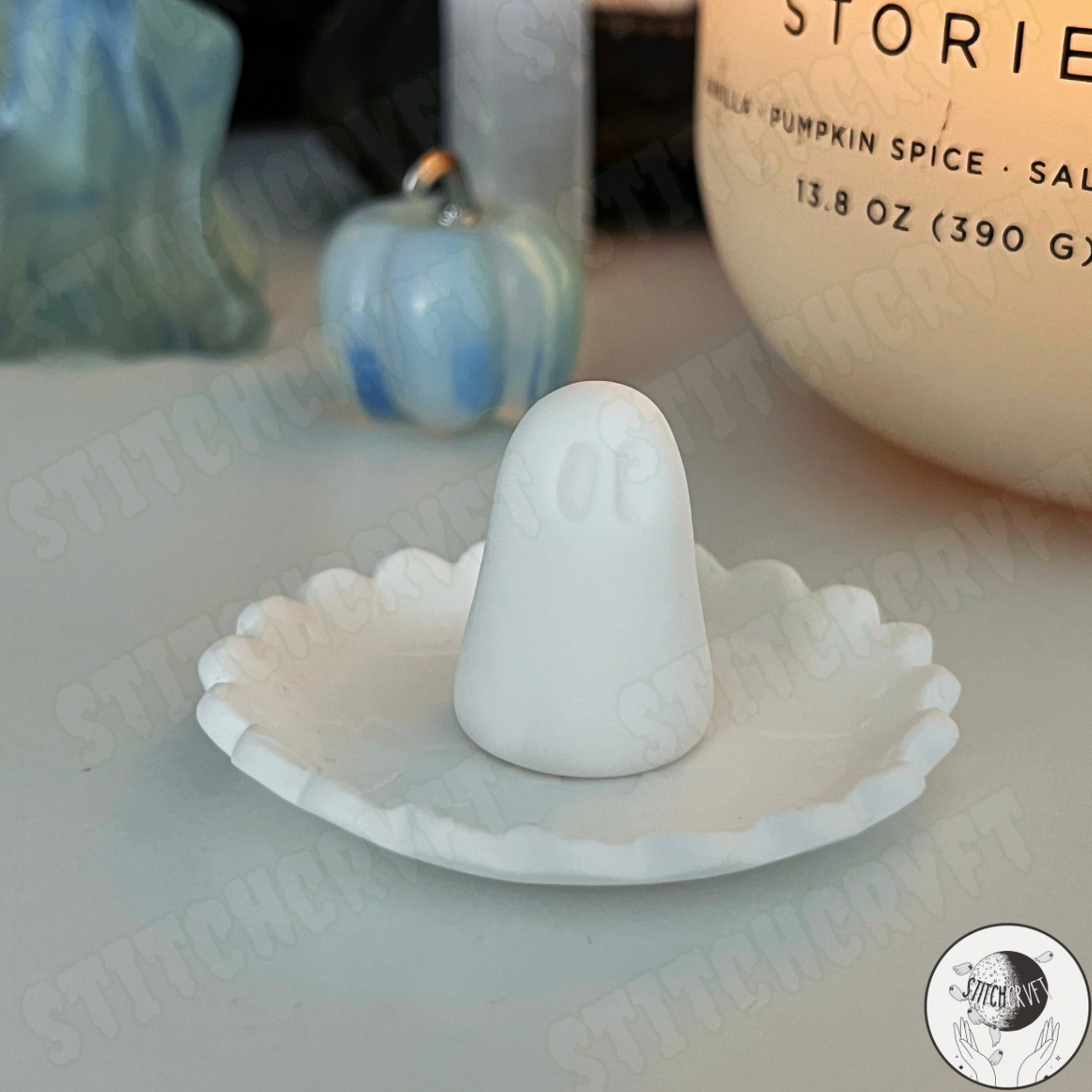 This cute little ghostie dish is hand rolled with a bat print texture sheet and shaped around the edges to hold your tiny treasures. In the center of the dish is a little ghostie ready to hold your precious rings!