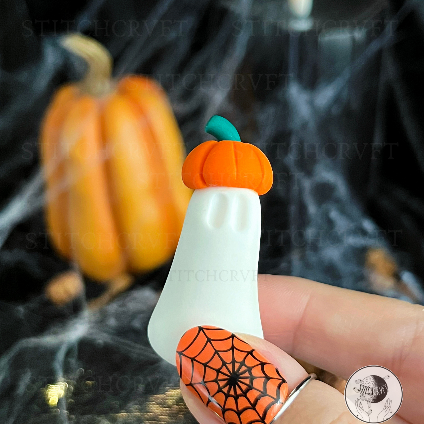 This fiendish little ghost is called Demeter and is wearing a cute little pumpkin hat!