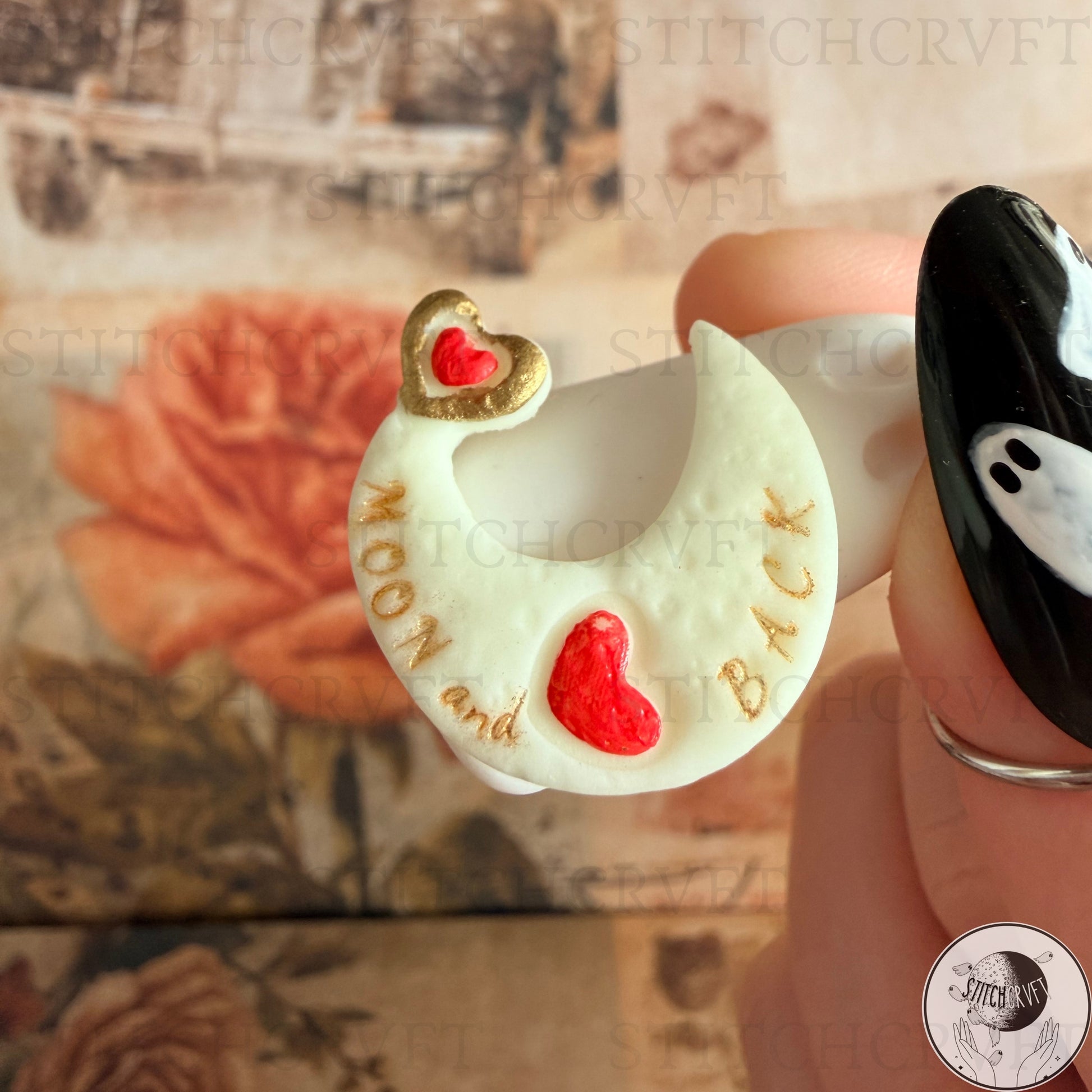 Each moon has been hand stamped with tiny golden letters spelling "moon and back" symbolising loving someone wholly and fully.