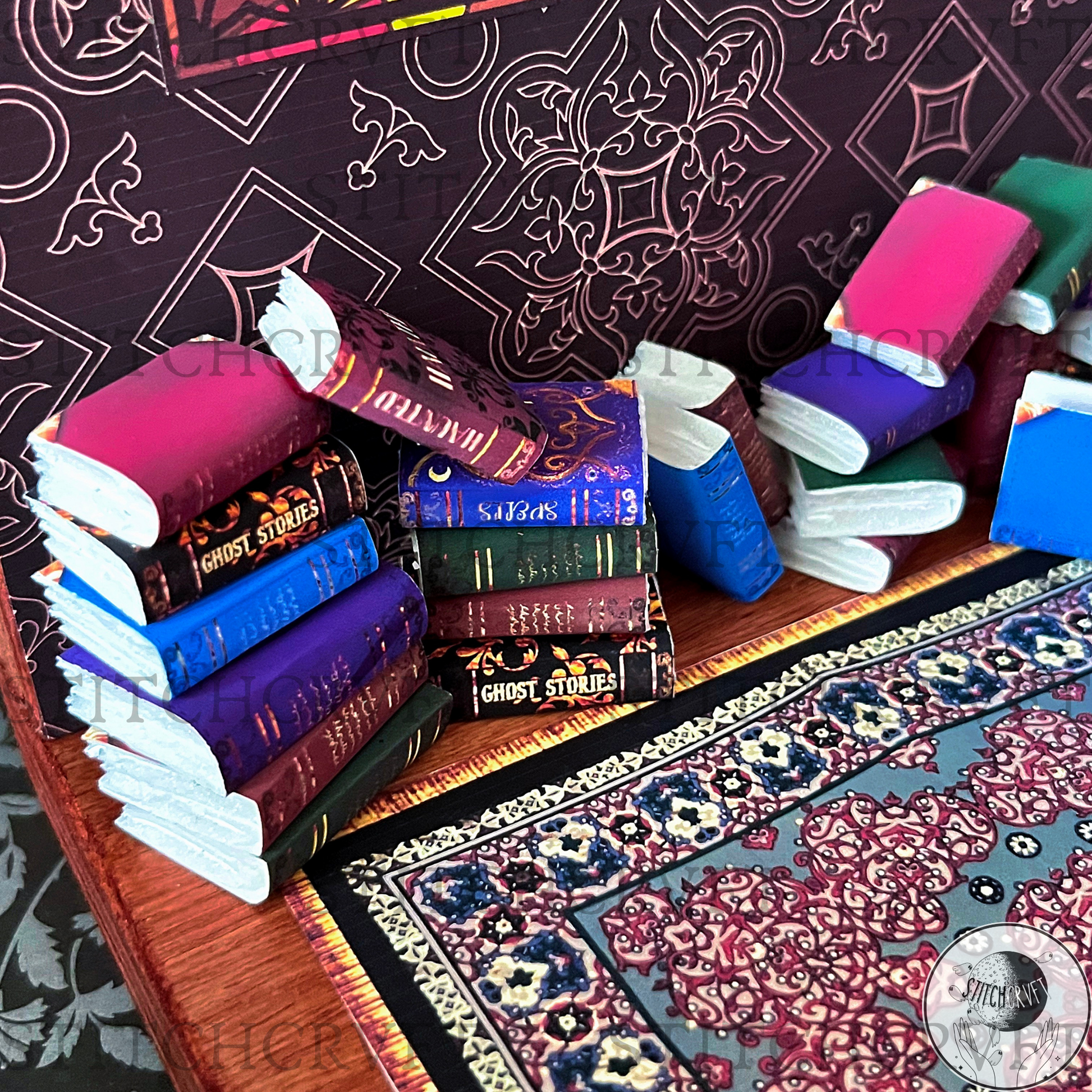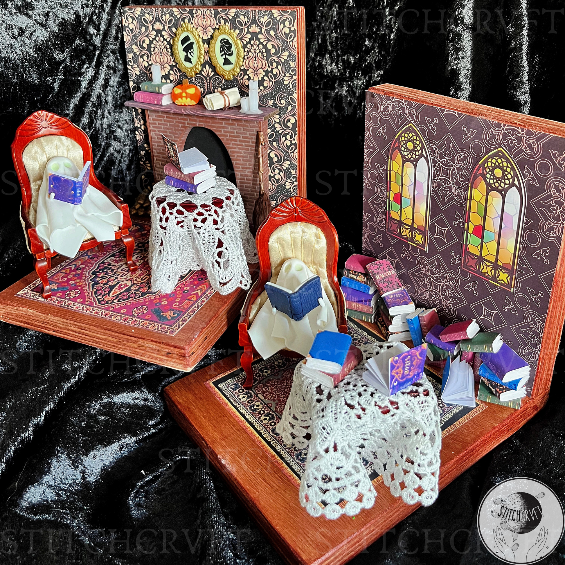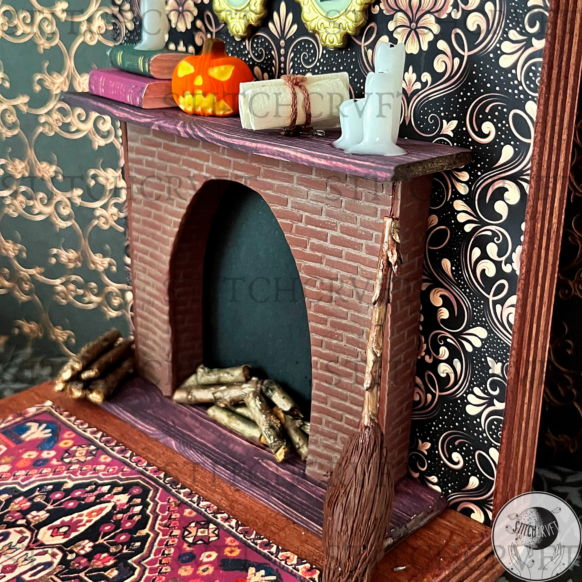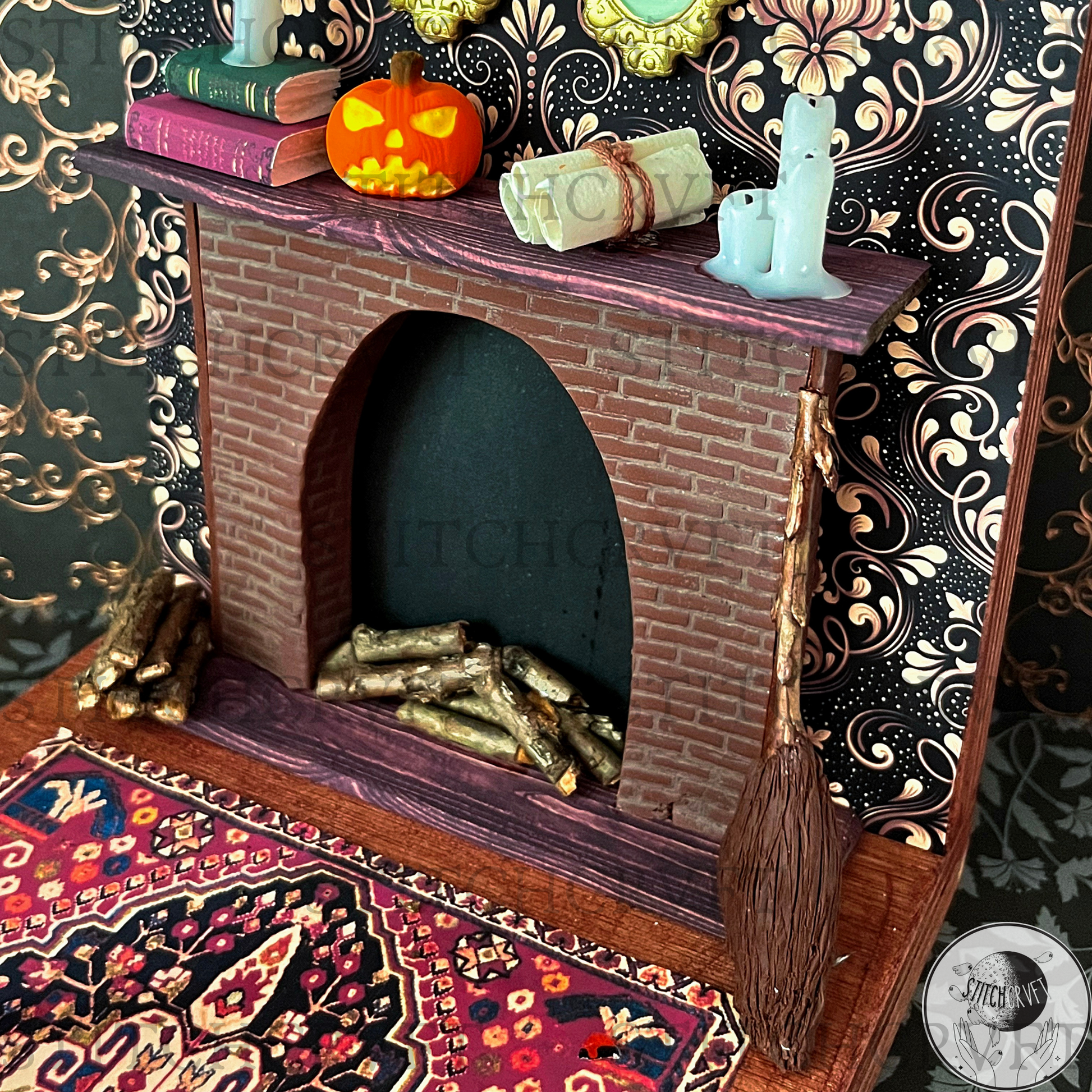 Featuring upcycled vintage dollhouse furniture that you can rearrange to your liking! The magical scenes include delightful handmade details: a handmade fireplace with itty-bitty real wooden logs, dripping "melting candles," a resting broomstick, glowing portraits, a 3D pumpkin and an abundance of miniature books with covers I've personally designed!