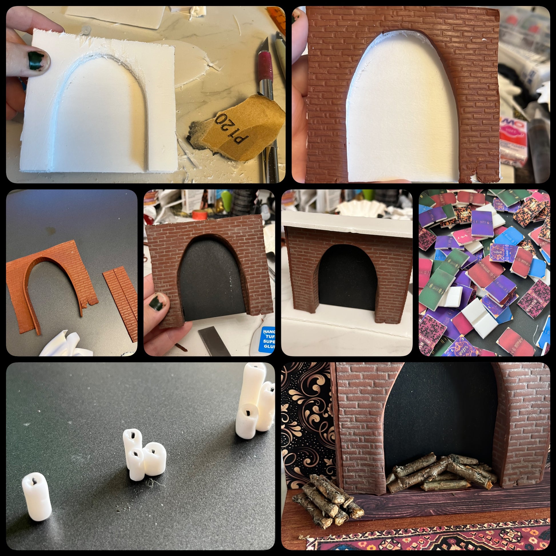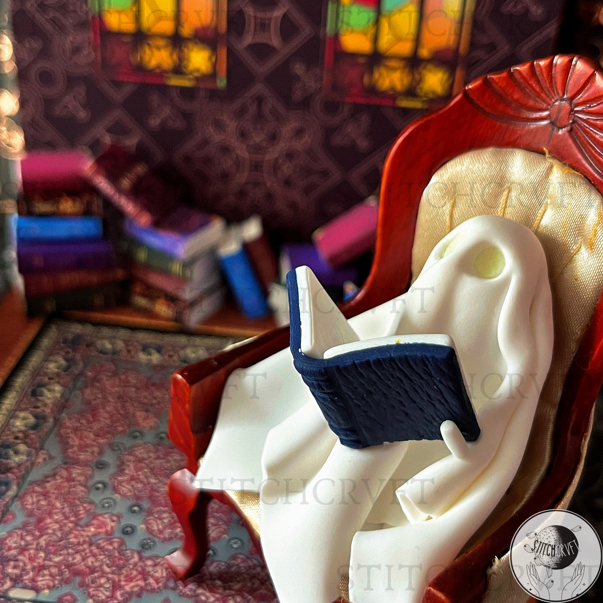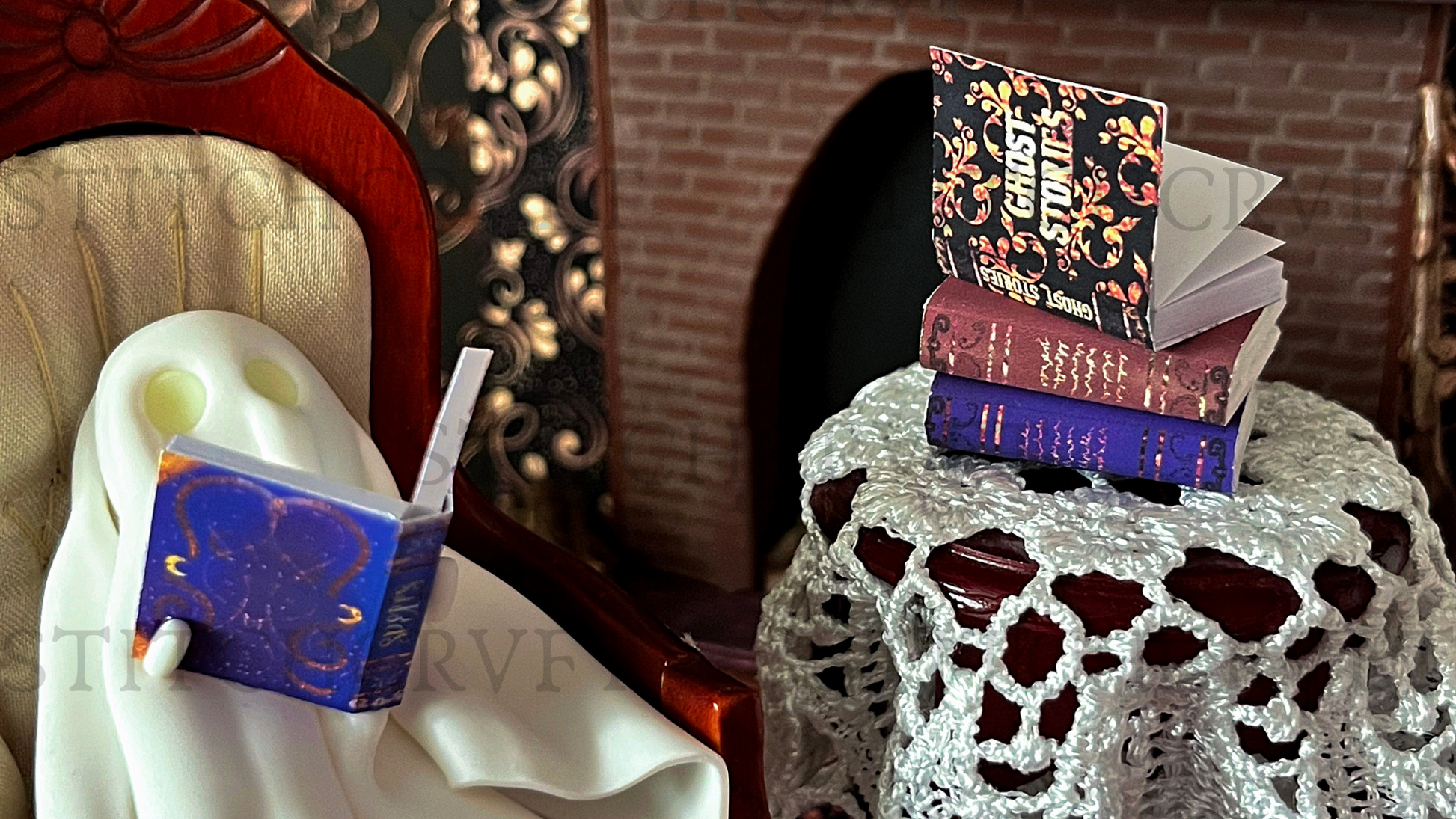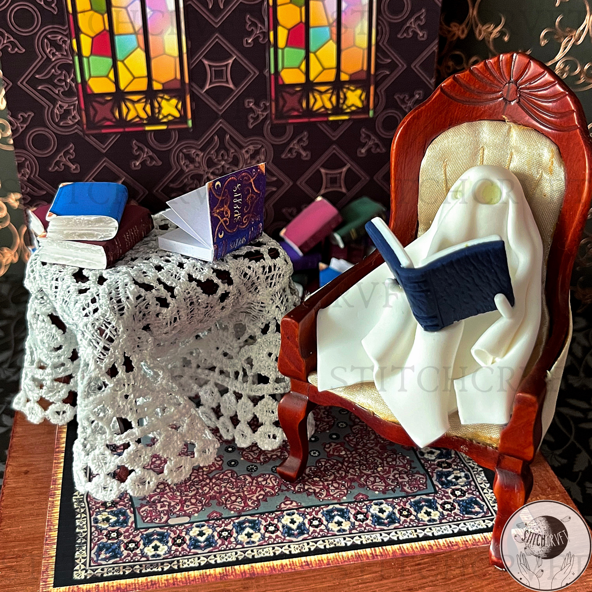 Featuring upcycled vintage dollhouse furniture that you can rearrange to your liking! The magical scenes include delightful handmade details: a handmade fireplace with itty-bitty real wooden logs, dripping "melting candles," a resting broomstick, glowing portraits, a 3D pumpkin and an abundance of miniature books with covers I've personally designed!