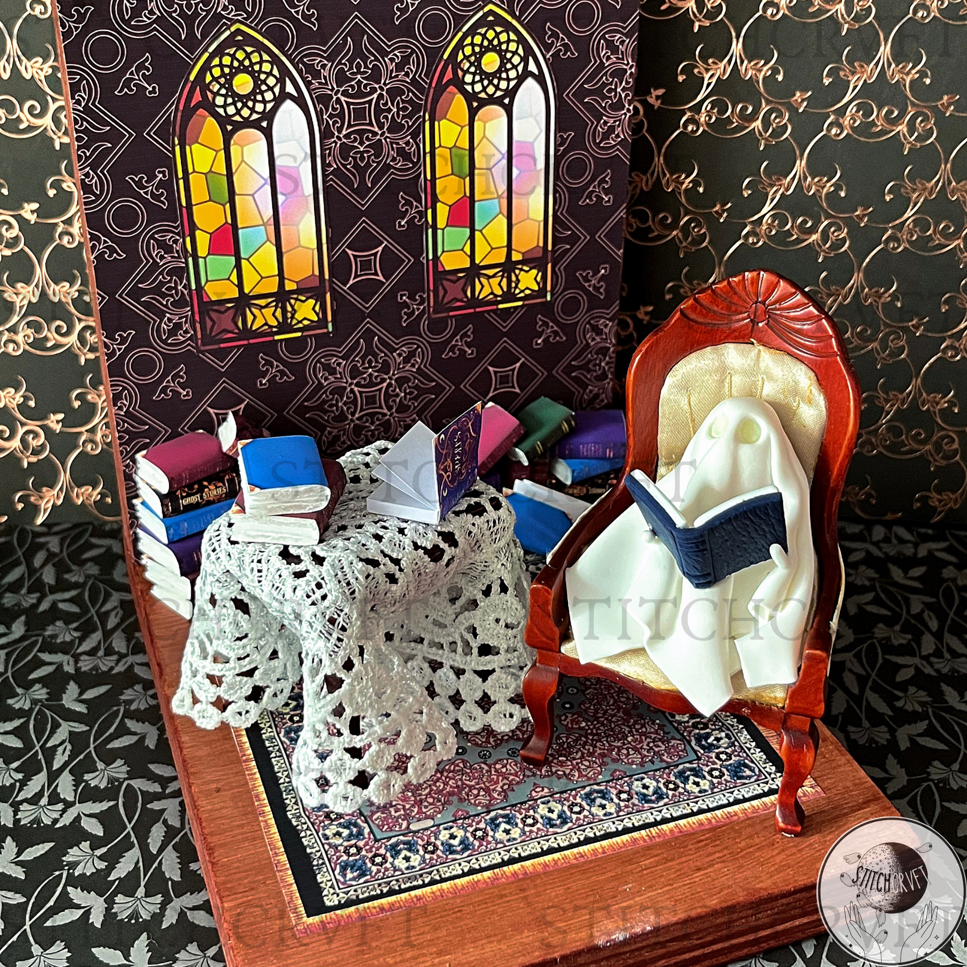 Each handmade and sturdy wooden piece is lovingly stained and adorned with playful handcrafted ghosts and bookish decorations.