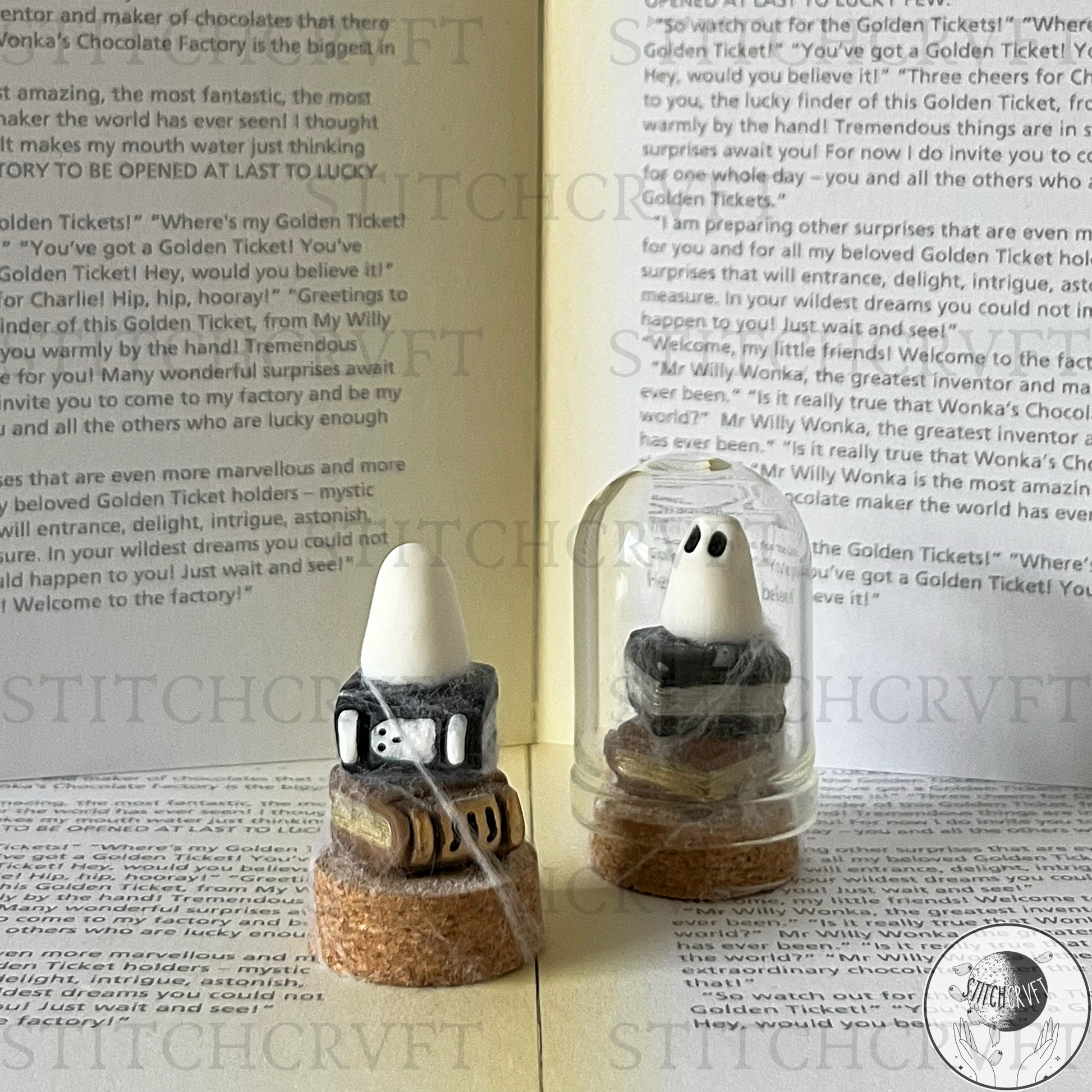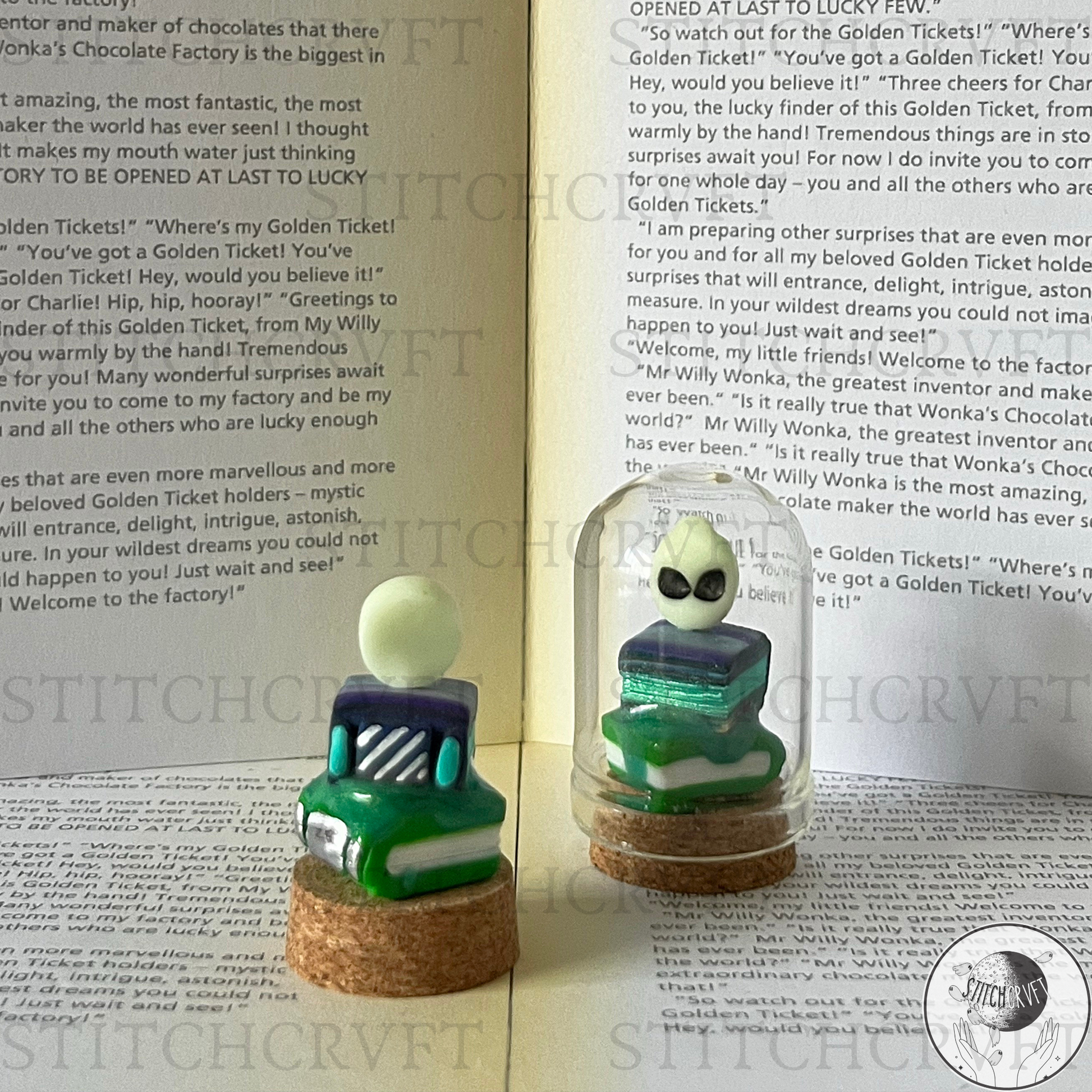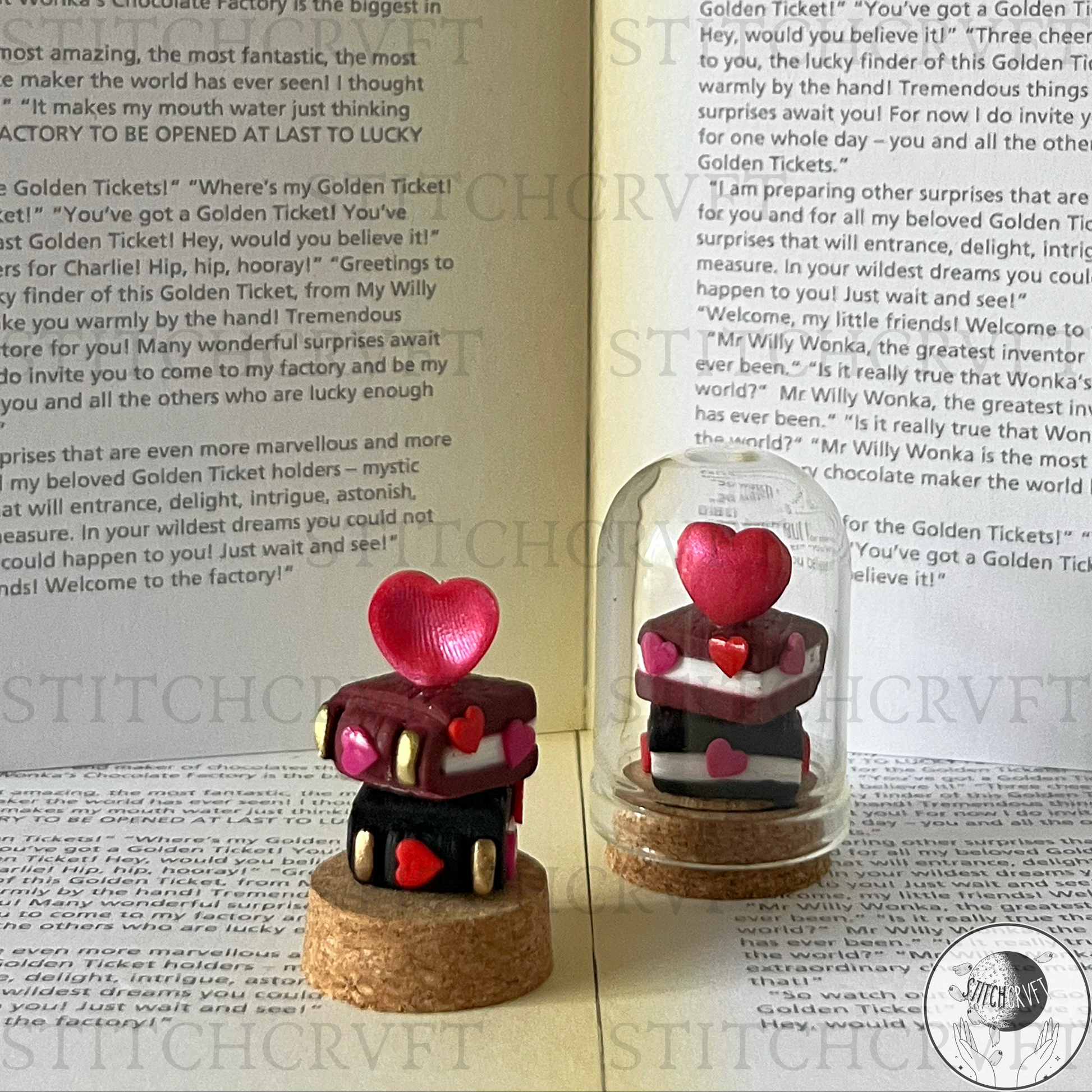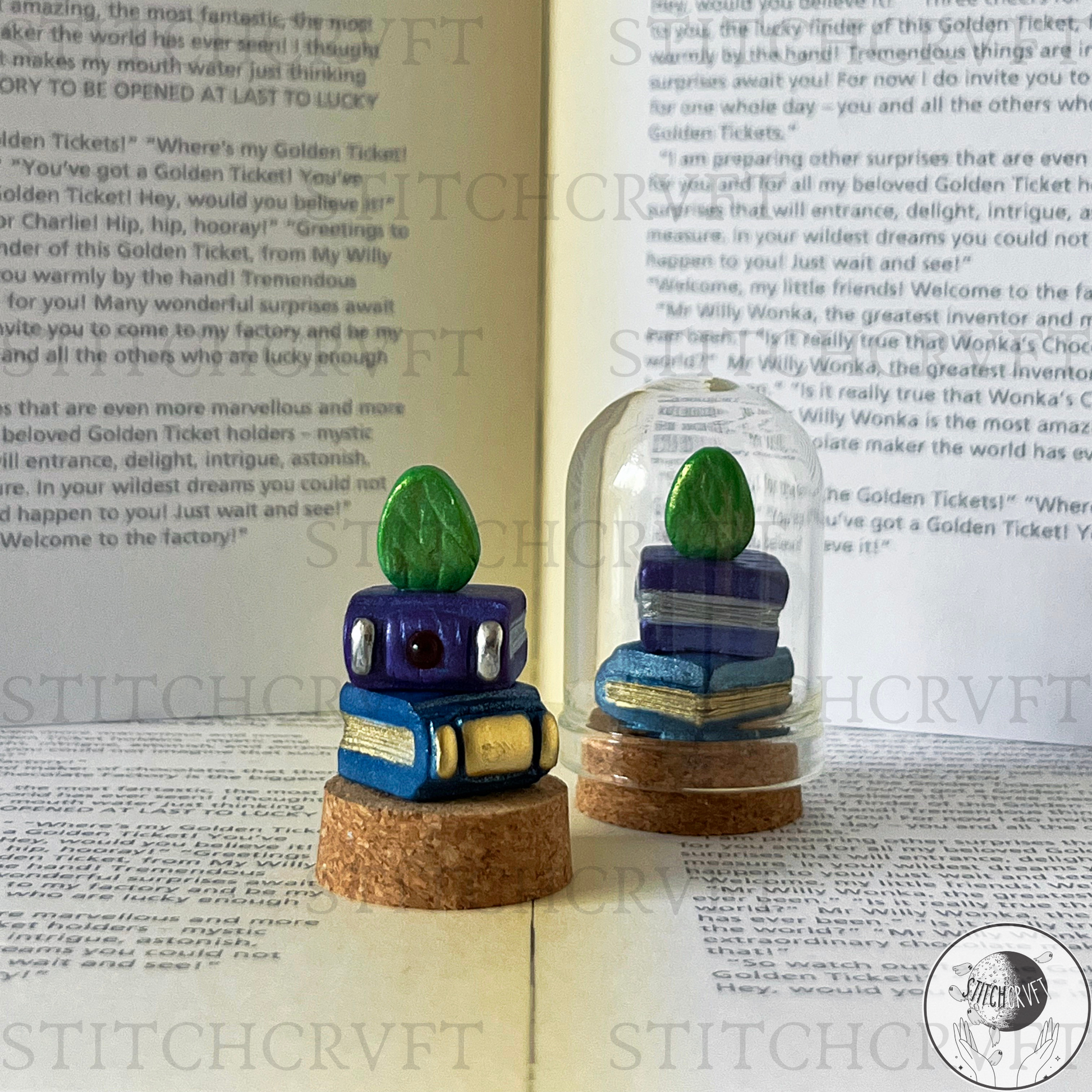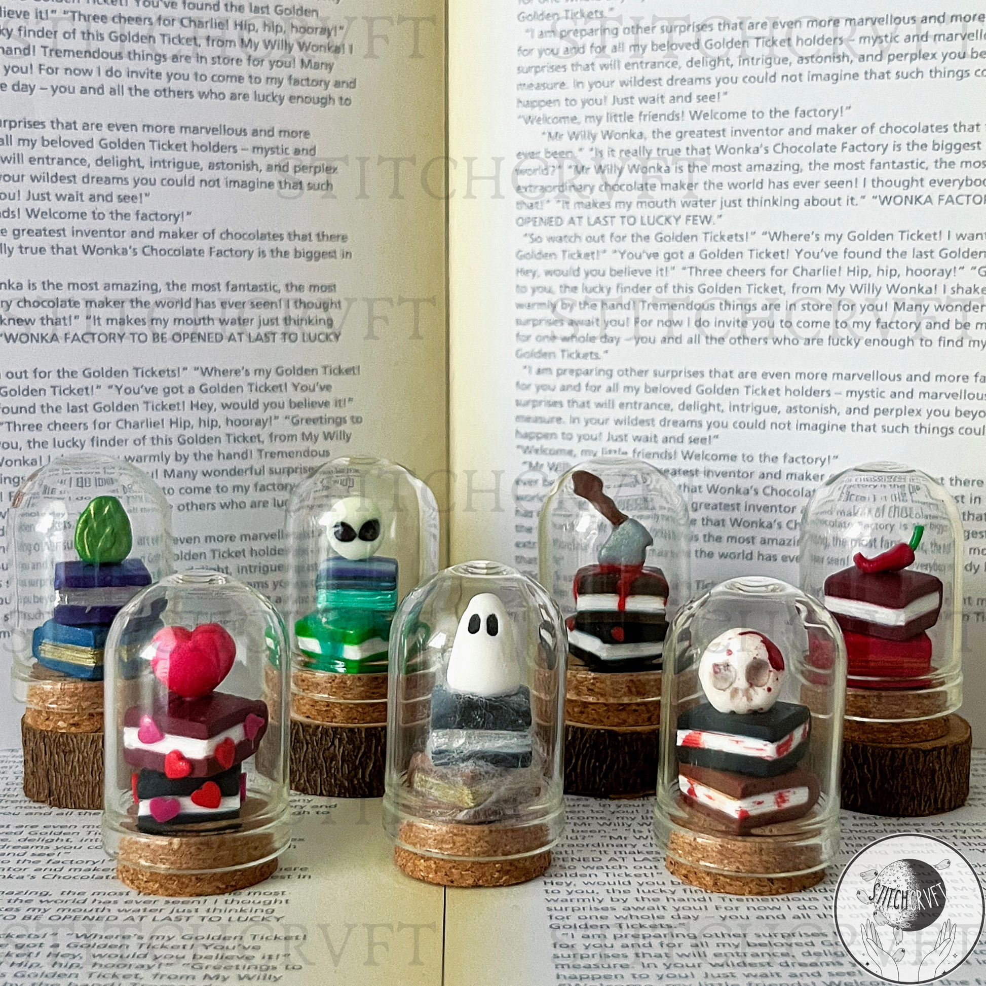 Each stack is carefully crafted to reflect the unique elements of its respective genre and comes enclosed in a miniature glass bell jar.