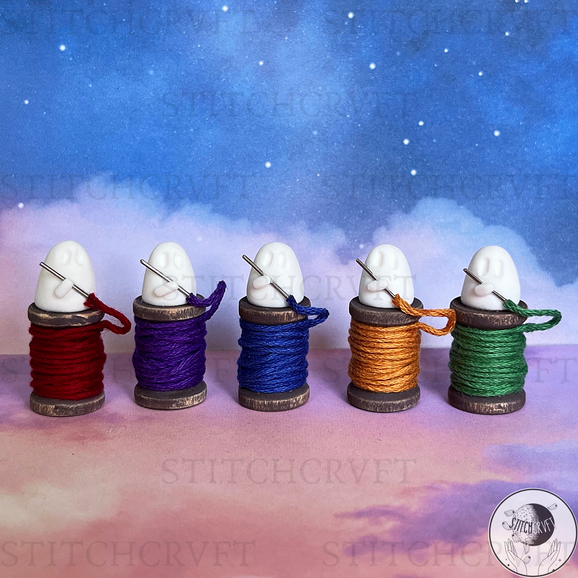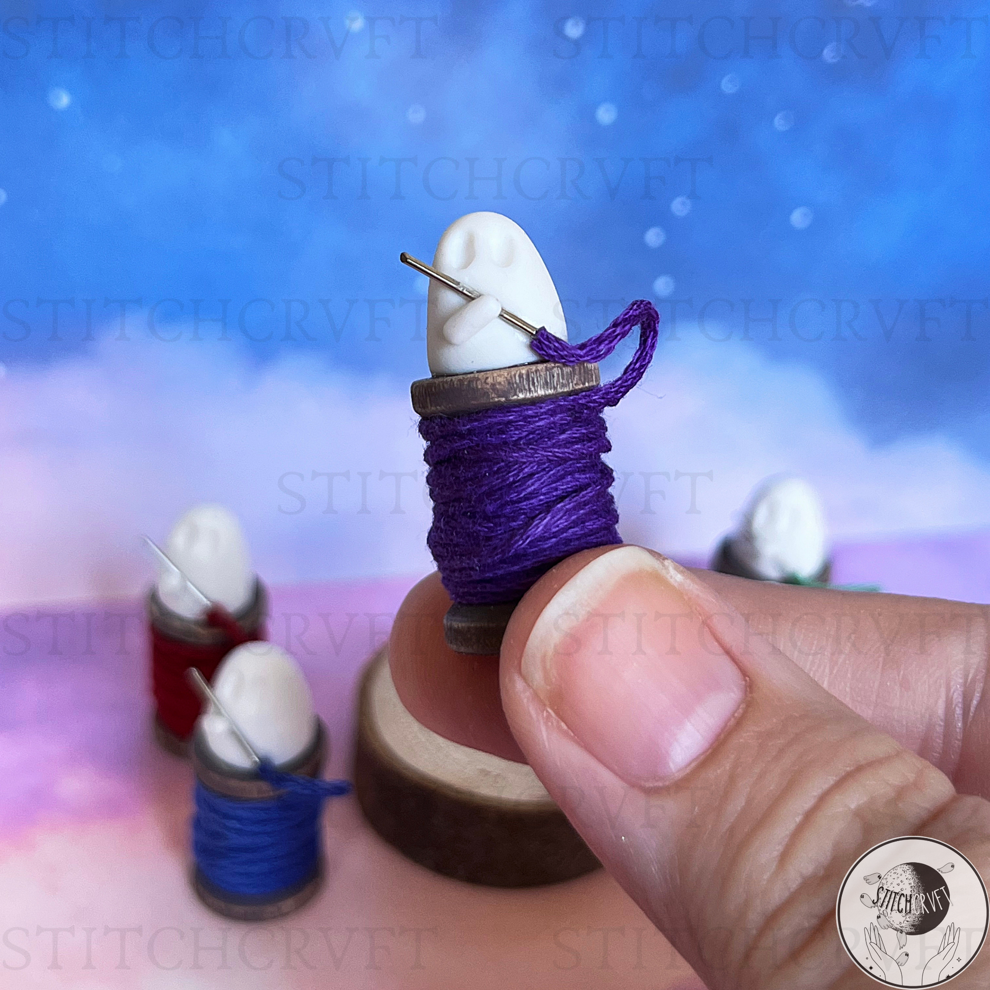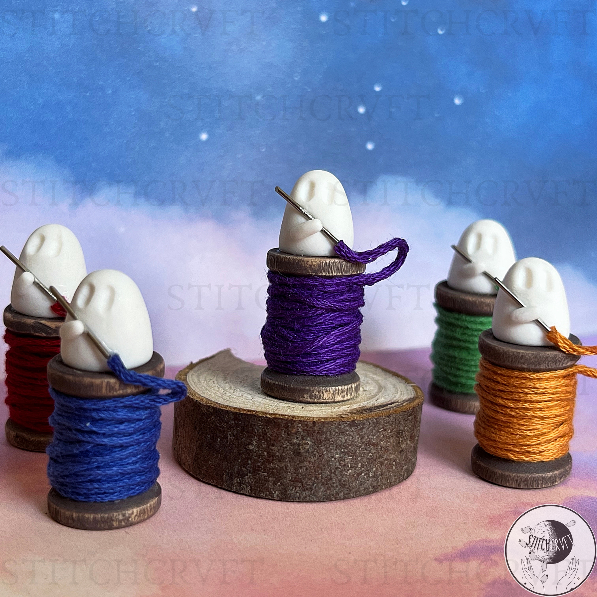 Each little wooden bobbin is stained and then wrapped in a embroidery thread with a tiny ghost perched on top. Each tiny ghost holds a mini "needle" ready to stitch away into the night!