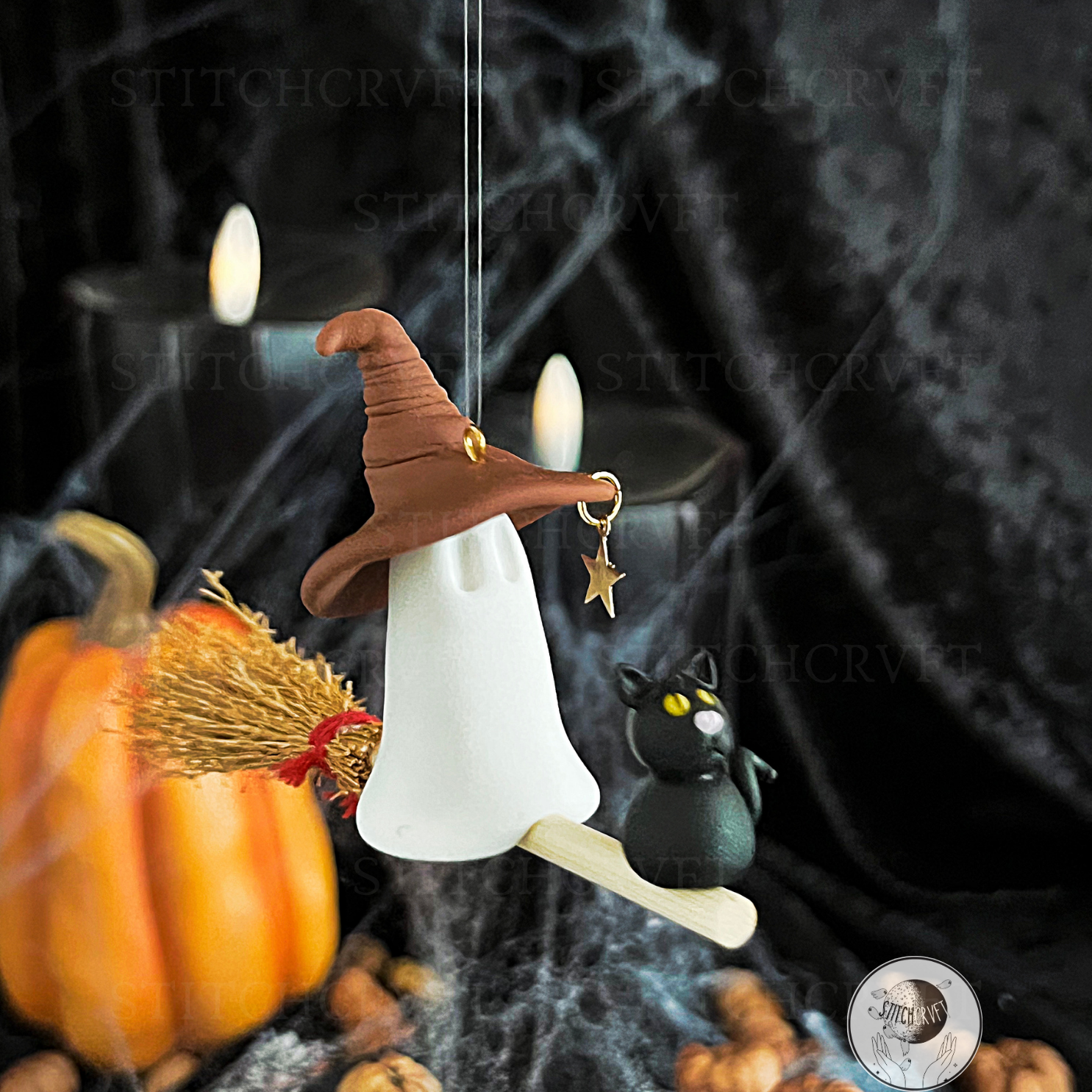 Witchy ghost riding broomstick with cat familiar | Hanging ornament | Handmade to order